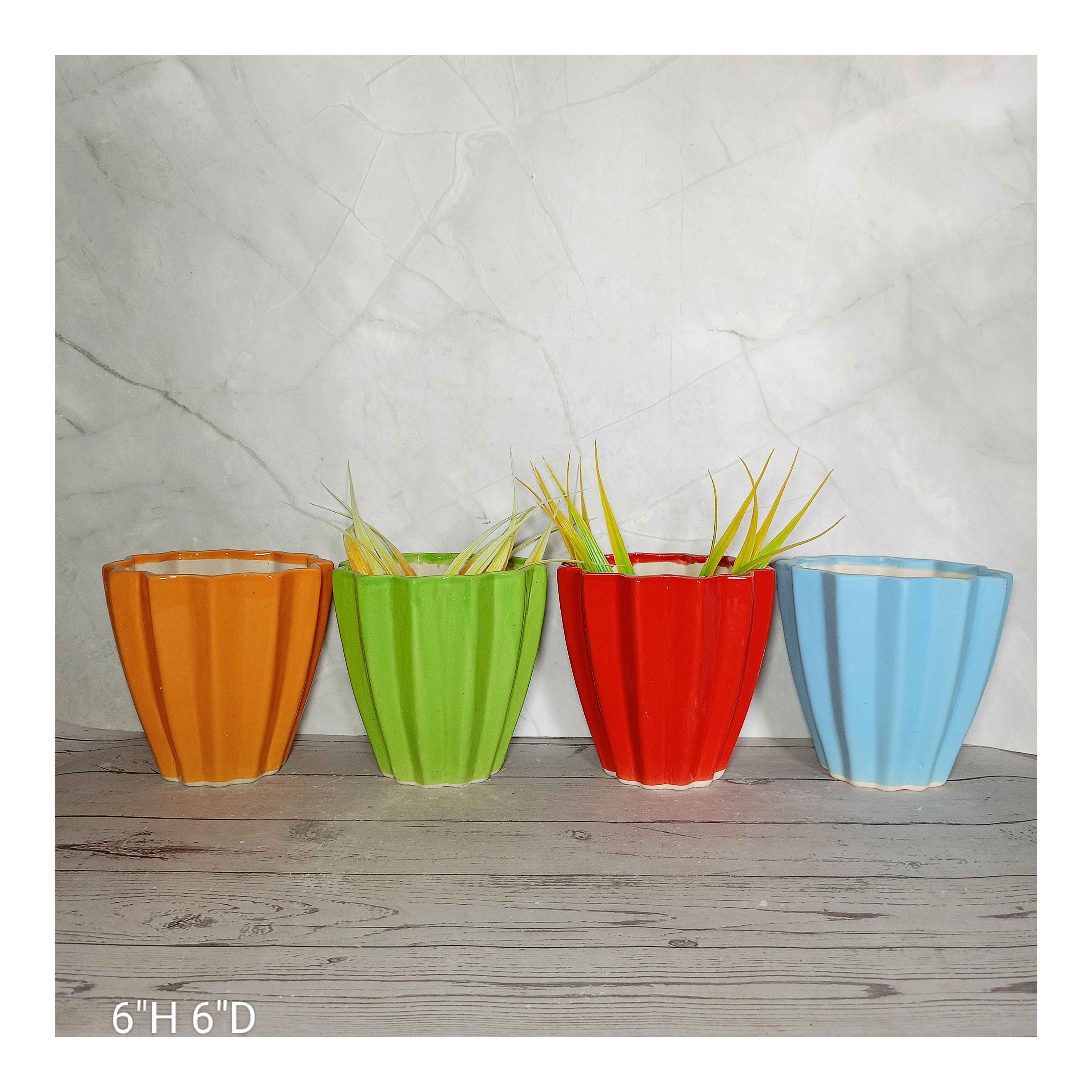 1. Introducing the exquisite collection of colorful planters from Abiya Ceramics, a renowned wholesale Khurja ceramic pot manufacturer. This set features four vibrant ceramic pots, each uniquely designed to enhance the aesthetic appeal of any indoor or outdoor space. Crafted with precision, these big Garari ceramic pots are not only visually striking but also durable, ensuring that they can withstand the test of time while providing a perfect home for your favorite plants. The vivid colors of the planters create a lively atmosphere, making them an ideal choice for those looking to add a splash of color to their surroundings.