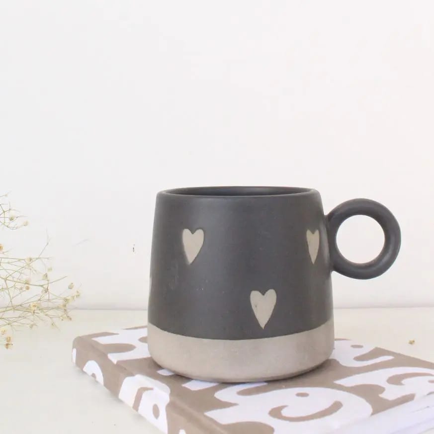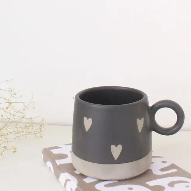 3. Shop Abiya Ceramics for exquisite black matt glazed heart mugs. Made in Khurja, these mugs are perfect for any occasion or as a thoughtful gift.