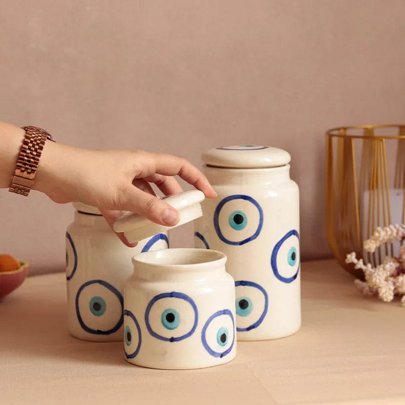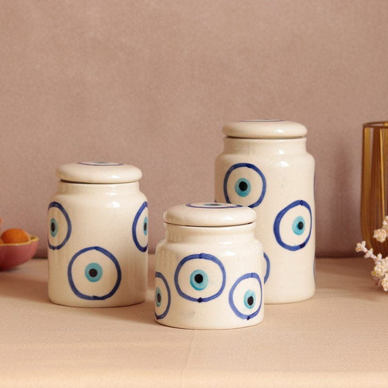 1. Discover the beauty of Khurja Ceramics with our 3-piece Evil Eye Jar set. Perfect for adding charm and protection to your home decor. Shop now!