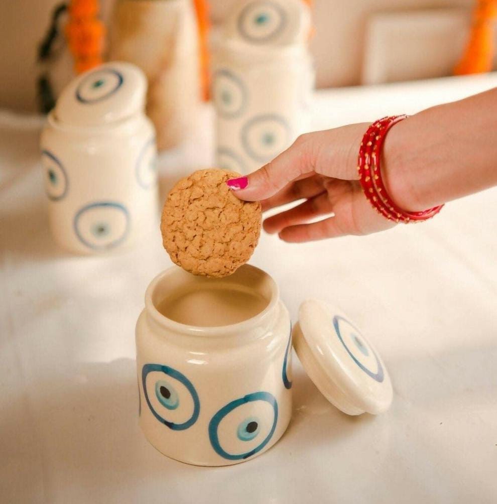 2. Elevate your space with our Khurja Ceramics 400 ML Evil Eye Jar. A beautiful blend of style and function, it's ideal for keeping your essentials safe.