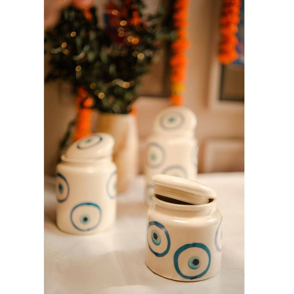 3. Explore the unique design of our 400 ML Evil Eye Jar from Khurja Ceramics. A perfect addition to your collection, it combines beauty with cultural significance.